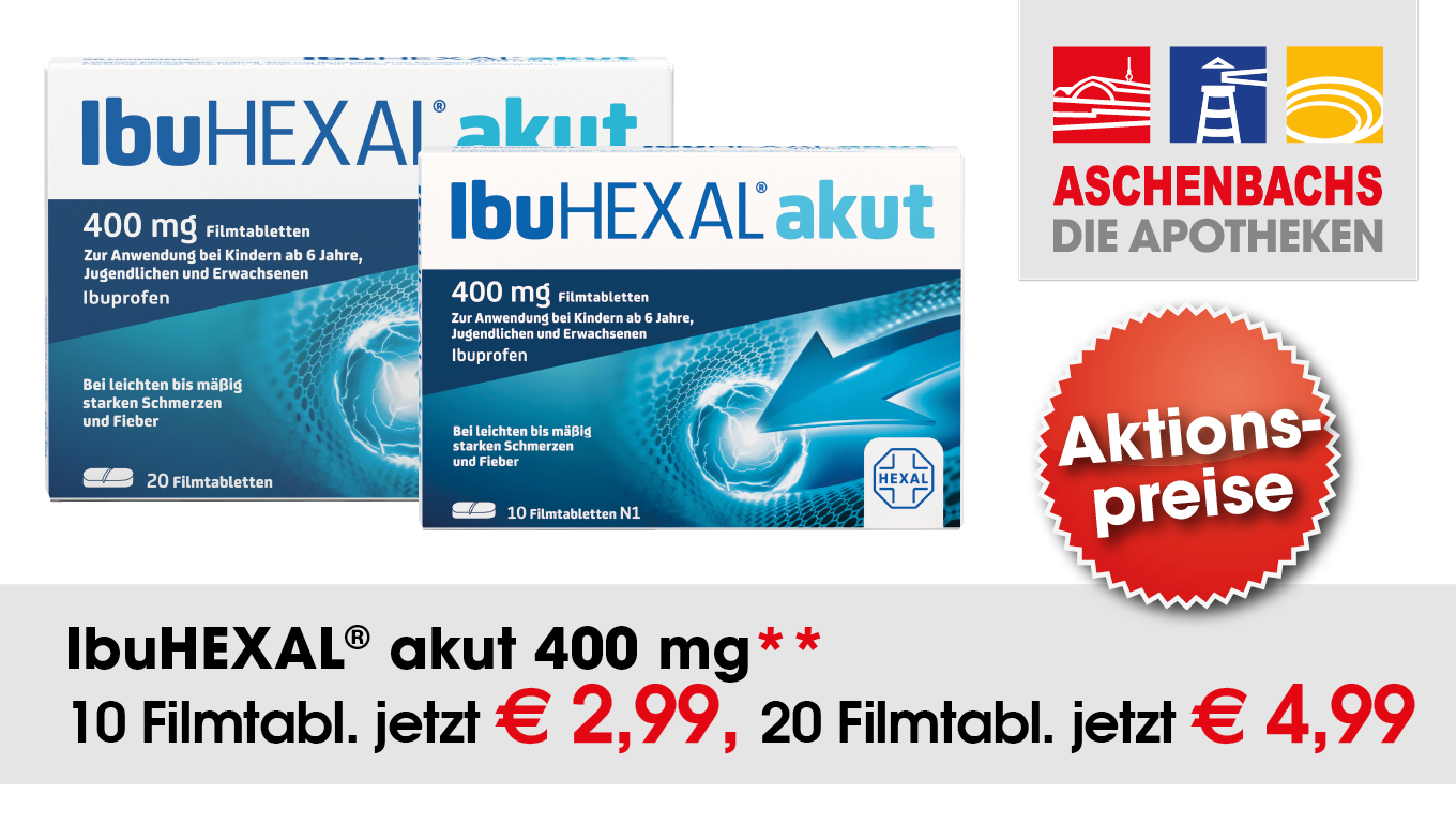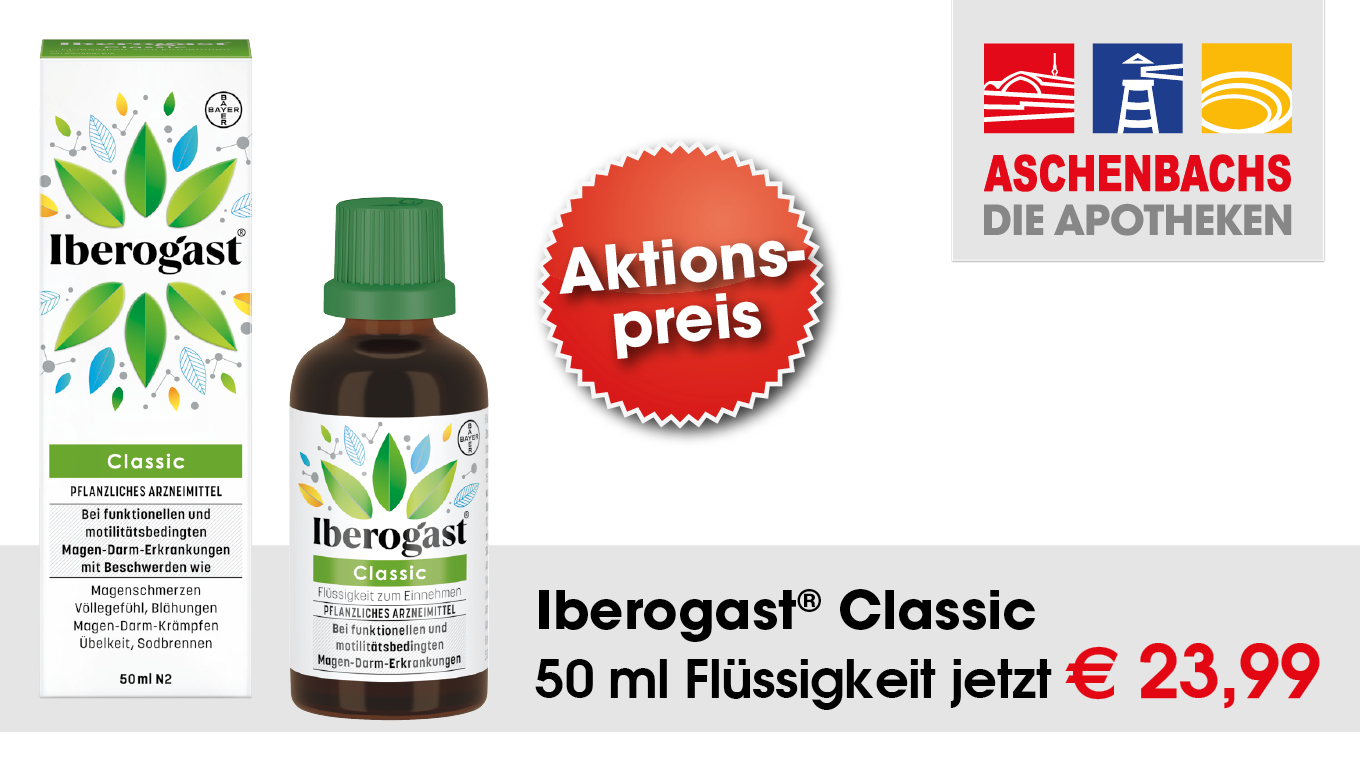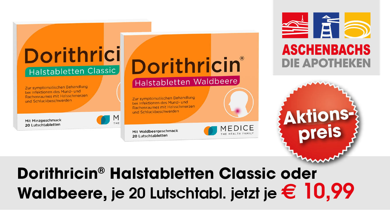 Ginkobil® ratiopharm 120 mg Filmtabletten. Wirkstoff: Ginkgo-biloba-Blätter-Trockenextrakt. Anwendungsgebiete: Zur symptomatischen Behandlung von hirnorganisch bedingten Leistungsstör. im Rahmen eines therapeutischen Gesamtkonzeptes bei Abnahme bzw. Verlust erworbener geistiger Fähigkeiten (dementielles Syndrom) mit den Hauptbeschwerden: Gedächtnisstörungen, Konzentrationsstörungen, depressive Verstimmung, Schwindel, Ohrensausen, Kopfschmerzen. Verlängerung der schmerzfreien Gehstrecke bei peripherer arterieller Verschlusskrankheit bei Stadium II nach FONTAINE („Schaufensterkrankheit“) im Rahmen physikalisch-therapeutischen Maßnahmen, insbesondere Gehtraining. Schwindel, Ohrgeräusche infolge Durchblutungsstörungen oder altersbedingten Rückbildungsvorgängen. Warnhinweis: AM enth. Lactose u. weniger als 1 mmol Natrium (23 mg) pro Filmtbl., d.h. es ist nahezu „natriumfrei“. Apothekenpflichtig. Stand: 1/25. ratiopharm GmbH, D-89079 Ulm; Iberogast® Classic. Zur Behandlung von funktionellen und motilitätsbedingten Magen-Darm-Erkrankungen wie Reizmagen- und Reizdarmsyndrom sowie zur unterstützenden Behandlung der Beschwerden bei Magenschleimhautentzündung (Gastritis). Diese Erkrankungen äußern sich vorwiegend in Beschwerden wie Magenschmerzen, Völlegefühl, Blähungen, Magen-Darm-Krämpfen, Übelkeit und Sodbrennen. Das Arzneimittel enthält 240 mg Alkohol (Ethanol) pro 20 Tropfen. Stand: 09/2023. Bayer Vital GmbH, 51373 Leverkusen; Prospan® Hustenliquid, Flüssigkeit zum Einnehmen. Wirkstoff: Efeublätter-Trockenextrakt. Zur Besserung der Beschwerden bei chronisch-entzündlichen Bronchialerkrankungen; akute Entzündungen der Atemwege mit der Begleiterscheinung Husten. Hinweis: Bei länger anhaltenden Beschwerden oder bei Auftreten von Atemnot, Fieber wie auch bei eitrigem oder blutigem Auswurf, sollte umgehend der Arzt aufgesucht werden. Stand : 10/2023. Engelhard Arzneimittel GmbH & Co.KG, 61138 Niederdorfelden; Mucosolvan® Hustensaft 30 mg/5 ml. Wirkstoff: Ambroxolhydrochlorid. Anwendungsgebiet: Zur Schleim lösenden Behandlung bei akuten und chronischen Erkrankungen der Bronchien und der Lunge mit zähem Schleim. Warnhinweis: Enthält Benzoesäure und Propylenglycol. Apothekenpflichtig. A. Nattermann & Cie. GmbH, Brüningstraße 50, 65929 Frankfurt am Main. Stand: Juli 2022; Dorithricin® Halstabletten Classic / Dorithricin® Halstabletten Waldbeere.Anwendungsgebiete: Zur symptomatischen Behandlung bei Infektionen des Mund- und Rachenraumes mit Halsschmerzen und Schluckbeschwerden. Dorithricin® Classic enthält Sorbitol und Minzöl. Dorithricin® Waldbeere enthält Sorbitol. Stand 04/2022. MEDICE Arzneimittel, 58638 Iserlohn; IbuHEXAL® akut 400 mg Filmtabletten, Wirkstoff: Ibuprofen. Anwendungsgebiete: Symptomatische Behandlung von leichten bis mäßig starken Schmerzen, wie Kopf-, Zahn-, Regelschmerzen; Fieber. Warnhinweis: Bei Schmerzen oder Fieber ohne ärztlichen Rat nicht länger anwenden als in der Packungsbeilage vorgegeben! Mat.-Nr.: 2/51017567 Stand: August 2025. Hexal AG, 83607 Holzkirchen.