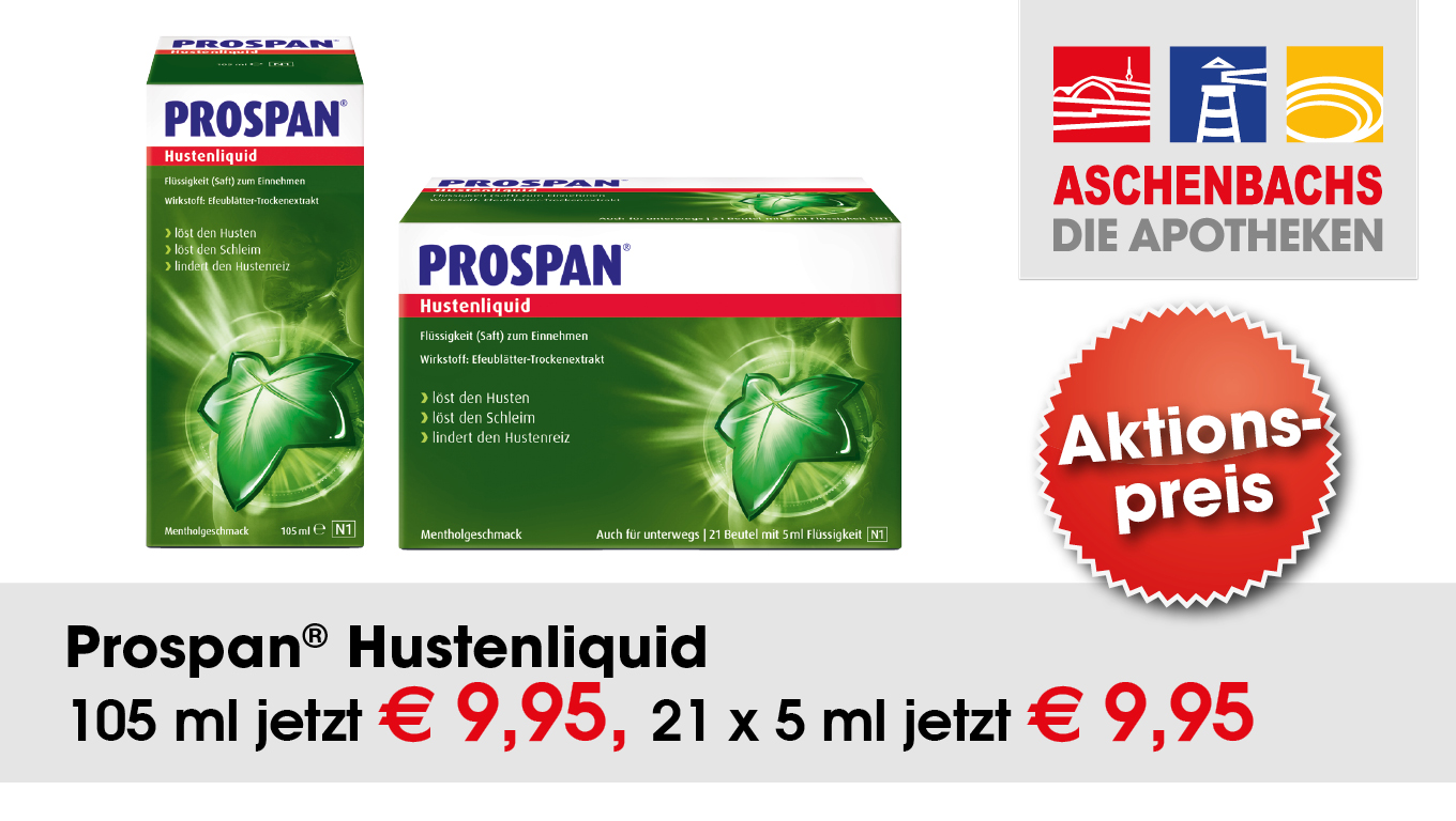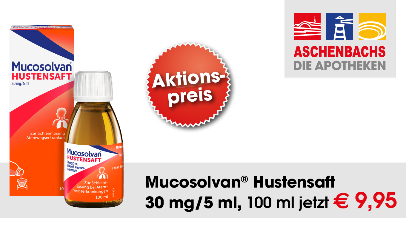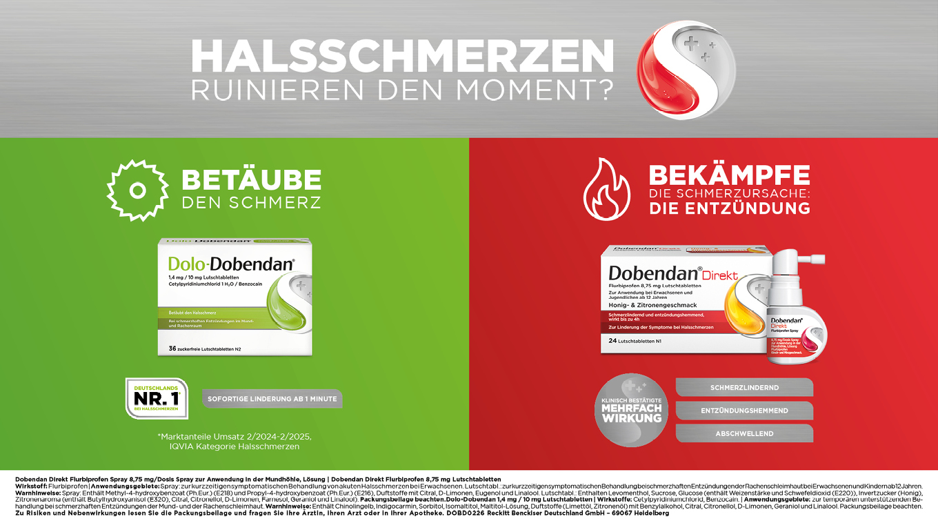 Ginkobil® ratiopharm 120 mg Filmtabletten. Wirkstoff: Ginkgo-biloba-Blätter-Trockenextrakt. Anwendungsgebiete: Zur symptomatischen Behandlung von hirnorganisch bedingten Leistungsstör. im Rahmen eines therapeutischen Gesamtkonzeptes bei Abnahme bzw. Verlust erworbener geistiger Fähigkeiten (dementielles Syndrom) mit den Hauptbeschwerden: Gedächtnisstörungen, Konzentrationsstörungen, depressive Verstimmung, Schwindel, Ohrensausen, Kopfschmerzen. Verlängerung der schmerzfreien Gehstrecke bei peripherer arterieller Verschlusskrankheit bei Stadium II nach FONTAINE („Schaufensterkrankheit“) im Rahmen physikalisch-therapeutischen Maßnahmen, insbesondere Gehtraining. Schwindel, Ohrgeräusche infolge Durchblutungsstörungen oder altersbedingten Rückbildungsvorgängen. Warnhinweis: AM enth. Lactose u. weniger als 1 mmol Natrium (23 mg) pro Filmtbl., d.h. es ist nahezu „natriumfrei“. Apothekenpflichtig. Stand: 1/25. ratiopharm GmbH, D-89079 Ulm; Iberogast® Classic. Zur Behandlung von funktionellen und motilitätsbedingten Magen-Darm-Erkrankungen wie Reizmagen- und Reizdarmsyndrom sowie zur unterstützenden Behandlung der Beschwerden bei Magenschleimhautentzündung (Gastritis). Diese Erkrankungen äußern sich vorwiegend in Beschwerden wie Magenschmerzen, Völlegefühl, Blähungen, Magen-Darm-Krämpfen, Übelkeit und Sodbrennen. Das Arzneimittel enthält 240 mg Alkohol (Ethanol) pro 20 Tropfen. Stand: 09/2023. Bayer Vital GmbH, 51373 Leverkusen; Prospan® Hustenliquid, Flüssigkeit zum Einnehmen. Wirkstoff: Efeublätter-Trockenextrakt. Zur Besserung der Beschwerden bei chronisch-entzündlichen Bronchialerkrankungen; akute Entzündungen der Atemwege mit der Begleiterscheinung Husten. Hinweis: Bei länger anhaltenden Beschwerden oder bei Auftreten von Atemnot, Fieber wie auch bei eitrigem oder blutigem Auswurf, sollte umgehend der Arzt aufgesucht werden. Stand : 10/2023. Engelhard Arzneimittel GmbH & Co.KG, 61138 Niederdorfelden; Mucosolvan® Hustensaft 30 mg/5 ml. Wirkstoff: Ambroxolhydrochlorid. Anwendungsgebiet: Zur Schleim lösenden Behandlung bei akuten und chronischen Erkrankungen der Bronchien und der Lunge mit zähem Schleim. Warnhinweis: Enthält Benzoesäure und Propylenglycol. Apothekenpflichtig. A. Nattermann & Cie. GmbH, Brüningstraße 50, 65929 Frankfurt am Main. Stand: Juli 2022; Dorithricin® Halstabletten Classic / Dorithricin® Halstabletten Waldbeere.Anwendungsgebiete: Zur symptomatischen Behandlung bei Infektionen des Mund- und Rachenraumes mit Halsschmerzen und Schluckbeschwerden. Dorithricin® Classic enthält Sorbitol und Minzöl. Dorithricin® Waldbeere enthält Sorbitol. Stand 04/2022. MEDICE Arzneimittel, 58638 Iserlohn; IbuHEXAL® akut 400 mg Filmtabletten, Wirkstoff: Ibuprofen. Anwendungsgebiete: Symptomatische Behandlung von leichten bis mäßig starken Schmerzen, wie Kopf-, Zahn-, Regelschmerzen; Fieber. Warnhinweis: Bei Schmerzen oder Fieber ohne ärztlichen Rat nicht länger anwenden als in der Packungsbeilage vorgegeben! Mat.-Nr.: 2/51017567 Stand: August 2025. Hexal AG, 83607 Holzkirchen.