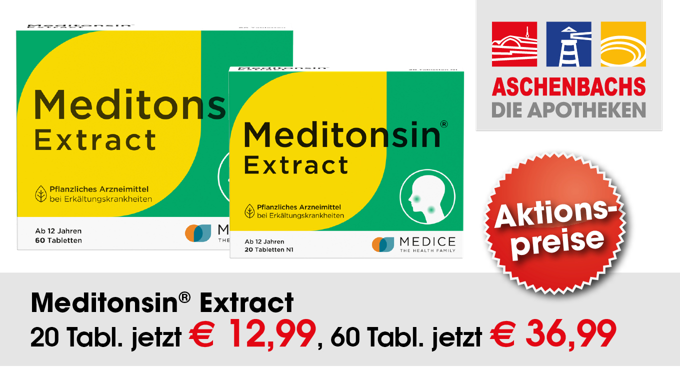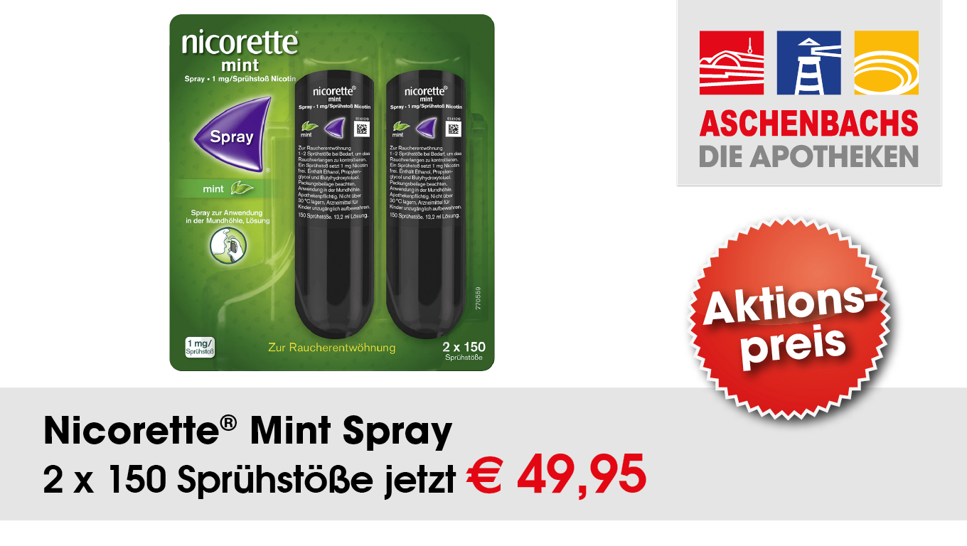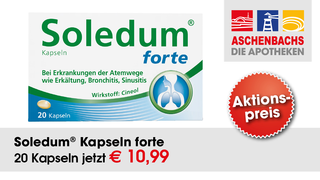 Nicorette® Mint Spray, 1 mg/Sprühstoß; 1 mg/Sprühstoß. Wirkstoff: Nicotin. Anwendungsgebiete: Behandlung der Tabakabhängigkeit bei Erwachsenen durch Linderung der Nicotinentzugssymptome, einschließlich des Rauchverlangens, beim Versuch das Rauchen sofort aufzugeben oder zur Verringerung des Zigarettenkonsums (Rauchreduktion), um auf diesem Weg den vollständigen Rauchausstieg zu erreichen. Die komplette Einstellung des Rauchens sollte das endgültige Ziel sein. Warnhinweise: Enthält Ethanol, Propylenglycol und Butylhydroxytoluol. Stand: 05/2025. Kenvue Germany GmbH, 41470 Neuss; Meditonsin® Extract Pflanzliche Erkältungstabletten. Anwendungsgebiet: Zur unterstützenden Therapie viraler Erkältungskrankheiten. Zu Risiken und Nebenwirkungen lesen Sie die Packungsbeilage und fragen Sie Ihre Ärztin, Ihren Arzt oder in Ihrer Apotheke. Apothekenpflichtig. Stand: 06/2025. Schaper & Brümmer GmbH & Co. KG, 38259 Salzgitter; Soledum® Kapseln forte, Wirkstoff: Cineol. Anwendungsgebiete: Zur Behandlung der Symptome bei Bronchitis, akuten, unkomplizierten, nicht bakteriellen Entzündungen der Nasennebenhöhlen (Rhinosinusitis) und Erkältungskrankheiten der Atemwege. Zur Zusatzbehandlung bei chronischen und entzündlichen Erkrankungen der Atemwege (z. B. der Nasennebenhöhlen). Warnhinweis: Enthält Sorbitol. Maria Clementine Martin Klosterfrau Vertriebsgesellschaft mit beschränkter Haftung, 50606 Köln; Prospan® Hustensaft, Flüssigkeit zum Einnehmen, Wirkstoff: Efeublätter-Trockenextrakt, Zur Besserung der Beschwerden bei chronisch-entzündlichen Bronchialerkrankungen; akute Entzündungen der Atemwege mit der Begleiterscheinung Husten. Enthält Kaliumsorbat, 2,5 ml enthalten 0,963 g Sorbitol. Stand: 07/2025. Engelhard Arzneimittel GmbH & Co.KG, 61138 Niederdorfelden; IbuHEXAL® akut 400 mg Filmtabletten, Wirkstoff: Ibuprofen. Anwendungsgebiete: Symptomatische Behandlung von leichten bis mäßig starken Schmerzen, wie Kopf-, Zahn-, Regelschmerzen; Fieber. Warnhinweis: Bei Schmerzen oder Fieber ohne ärztlichen Rat nicht länger anwenden als in der Packungsbeilage vorgegeben! Mat.-Nr.: 2/51017567 Stand: August 2025. Hexal AG, 83607 Holzkirchen; ADDITIVA VITAMIN C 1.000 mg Blutorange/Zitrone. Bezeichnung: ADDITIVA Vitamin C. Für Erwachsene. Wirkstoffe: Ascorbinsäure. Anwendungsgebiet: zur Behandlung von Vitamin C Mangel-Krankheiten (z.B. Skorbut). Warnhinweise: enthält 321 mg Natrium pro Brausetablette (Vorsicht für Personen bei natriumarmer/kochsalzarmer Diät) und 305,5 mg Sorbitol (Einnahme in Rücksprache mit dem Arzt bei Unverträglichkeit gegenüber bestimmten Zuckern) Die in Additiva Vitamin C enthaltenen Farbstoffe Gelborange S (E 110) und Azorubin (E 122) können allergische Reaktionen auslösen. Zu weiteren Information siehe Packungsbeilage. Dr. B. Scheffler Nachf. GmbH & Co.KG, D-51469 Bergisch Gladbach.